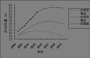 2、养老金的支出还会继续上升。“名义账户”的引入虽然改变了养老金支出明显上升的趋势,在理论上讲具有积极的性质,但在实施过程中却存在着一些问题。1995年改革选择“名义账户”制之后,随着人口老龄化的发展,养老金债务仍在上升。此外,养老金指数化的变化更加促进了养老金支出的上升。养老金支出虽然在2030年以后会出现下降的趋势,但至少在最近一二十年内还是处于上升趋势。整个养老金公共支出占GDP的比率将由2001年的13.8%上升到2033年的16.0% 17,因此,在较长时期内,财政问题并未得到根本的解决。