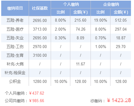 单位五险一金最低缴费金额=512.05+297.04+18.87+29.7+128=985.66元