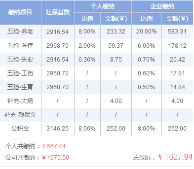 单位五险一金最低缴费金=583.31+178.12+20.42+17.81+14.84+4.00+252=1070.50