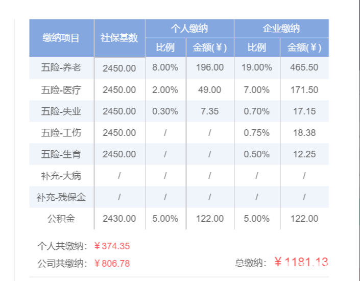 个人五险一金最低缴费金额=196+49+7.35+122=374.35元