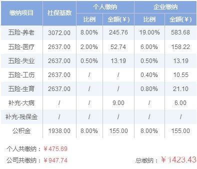 个人五险一金最低缴费金额=245.76+52.74+13.19+9+155=475.69元。