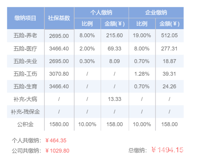 个人五险一金最低缴费金额=215.6+69.33+8.09+158=464.35元