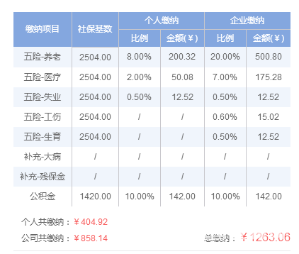 工伤保险最低缴费金额:单位:2504×0.6%=15.02;个人:不用交。