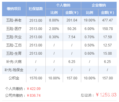 医疗保险最低缴费金额:单位:2513×6%=150.78元;个人:2513×2%=50.26元。