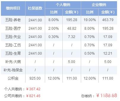 个人五险一金最低缴费金额=195.28+48.82+7.32+5+111=367.42元