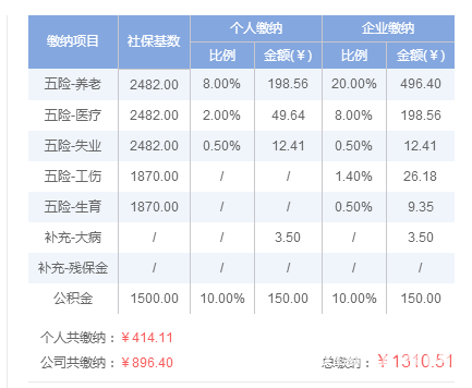单位五险一金最低缴费金额=496.4+198.56+12.41+26.18+9.35+150=896.4元