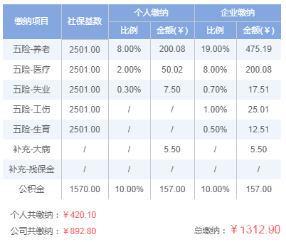 医疗保险最低缴费金额:单位:2501×8%=200.08元;个人:2501×2%=50.02元。