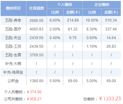医疗保险最低缴费金额:单位:4065.83×8.3%=337.46元;个人:4065.83×2%=81.32元。