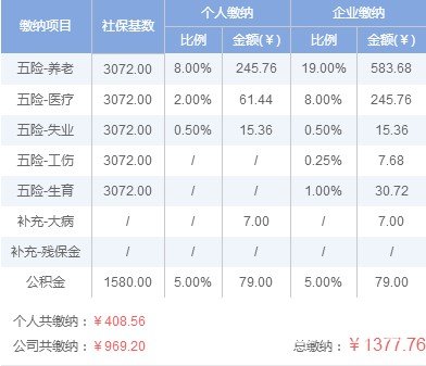 医疗保险最低缴费金额:单位3072.00×6%=245.76元;个人3072.00×2%=61.44元。