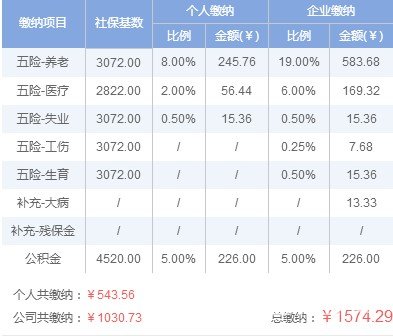 养老保险最低缴费金额:单位3072.00×19%=583.68元;个人3072.00×8%=245.76元。