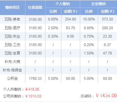 医疗保险、生育保险、工伤保险、养老保险、失业保险、按照3185.00元做为缴费基数,公积金按照1768.33元做为缴费基数。