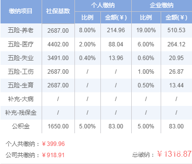 单位五险一金最低缴费金=510.53+264.12+264.12+20.95+26.87+13.44+83=918.91元。