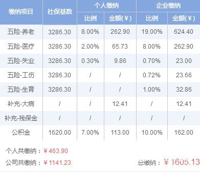 医疗保险、生育保险、养老保险、失业保险、工伤保险按照3286.30元做为最低缴费基数;