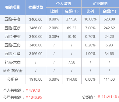 医疗保险、生育保险、工伤保险、养老保险、失业保险、按照3466元做为最低缴费基数,公积金按照1910元做为最低缴费基数。