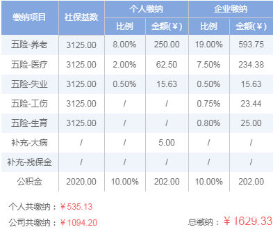 养老保险最低缴费金额:单位:3125×19%=593.75元;个人:3125×8%=250元。