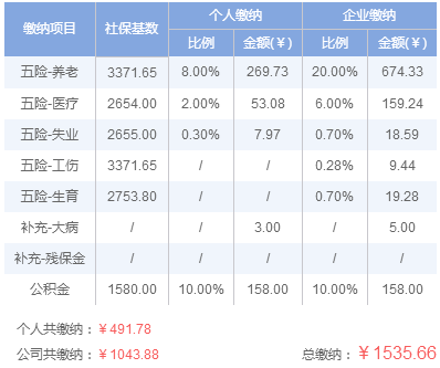个人五险一金最低缴费金额=269.73+53.08+7.97+158=491.78元