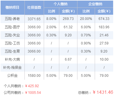 个人五险一金最低缴费金额=269.73+61.32+9.2+79=425.92元