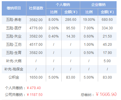 个人五险一金最低缴费金额=286.6+95.5+14.30+83=479.40元