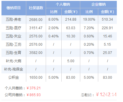 个人五险一金最低缴费金额=214.88+63.03+10.30+5+83=376.21元