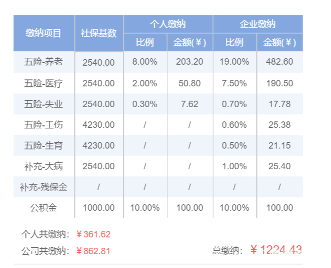 个人五险一金最低缴费金额=203.2+50.8+7.62+100=361.62元
