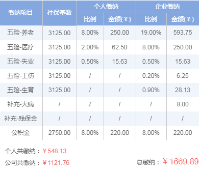 医疗保险最低缴费金额:单位:3125×8%=250元;个人:3125×2%=62.5元。