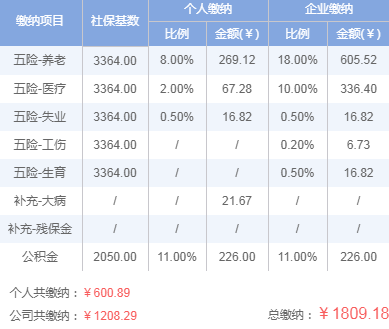 单位五险一金最低缴费金额:605.52+336.4+16.82+6.73+16.82+226=1208.29元