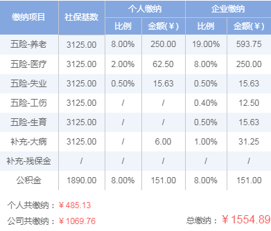 医疗保险最低缴费金额:单位:3125×8%=250元;个人:3125×2%=62.5元。