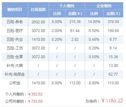 养老保险最低缴费金额:单位:2692×14%=376.88元;个人:2692×8.00%=215.36元。