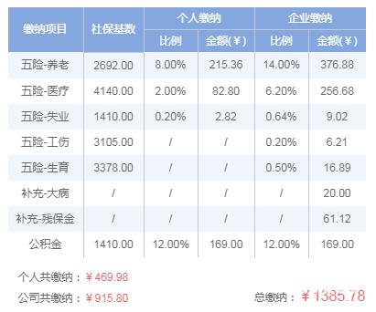 医疗保险最低缴费金额:单位:4140×6.2%=256.68元;个人:4140×2.00%=82.80元。