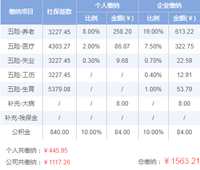 个人五险一金最低缴费金额:258.2+86.07+9.68+8+84=445.95元