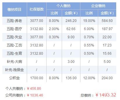 个人五险一金最低缴费金额=246.2+62.66+9+3+136=456.86元。
