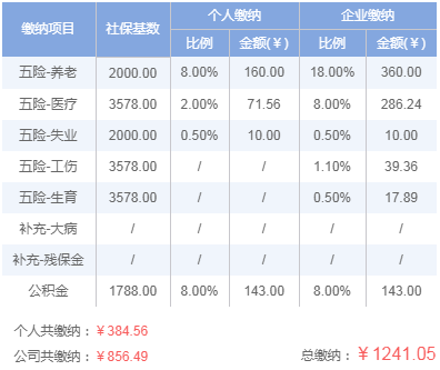 医疗保险、生育保险、工伤保险按照3578元做为最低缴费基数,养老保险、失业保险按照2000元做为最低缴费基数,公积金按照1788元做为最低缴费基数。