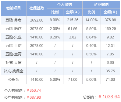 养老保险最低缴费金额:单位:2692×14%=376.88元;个人:2692×8%=215.36元。
