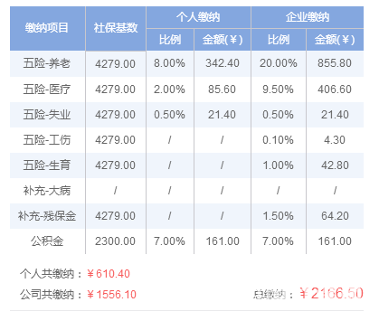 养老保险、失业保险、工伤保险、医疗保险和生育保险按照月平均工资的60%(4279元)计算,公积金按照最低工资2300元计算。