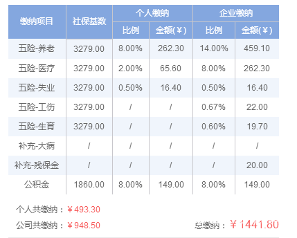 个人五险一金最低缴费金额=262.3+65.6+16.4+149=493.30元