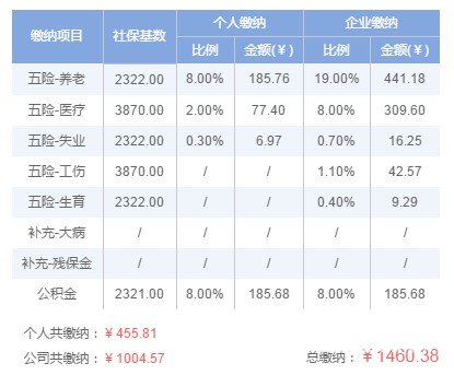 养老保险最低缴费金额:单位:2322×19%=441.18元;个人:2322×8%=185.76元。