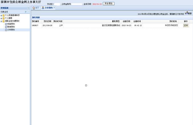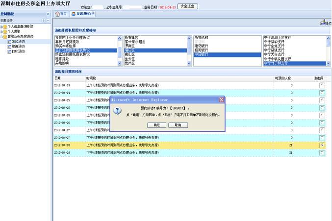 选择预约内容后,点击“提交”,系统预约成功。提交成功后,选择“确定”,则直接打印预约回单;选择“取消”,可在需要打印时进入打印预约菜单进行打印。预约回单不强制打印,住房公积金业务柜台可凭职工身份证号码或预约编号直接调出预约信息。