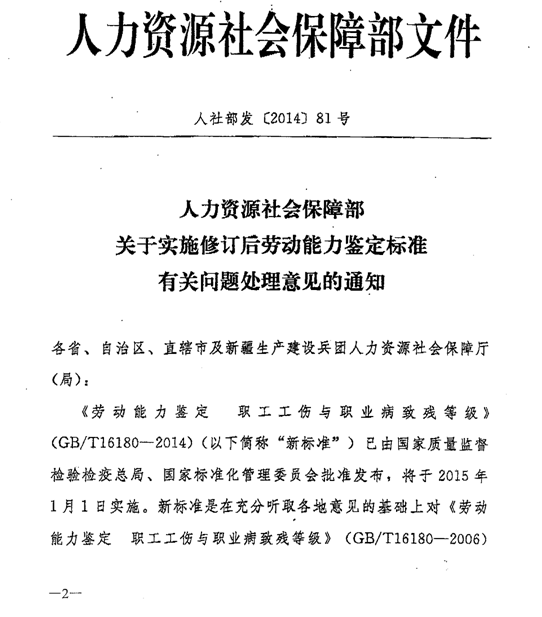 现将《人力资源社会保障部关于实施修订后劳动能力鉴定标准有关问题处理意见的通知》(人社部发〔2014〕81号)转发给你们,请遵照执行。新标准实施中遇到重大问题请及时报我厅工伤保险处(省劳动能力鉴定委员会办公室)。