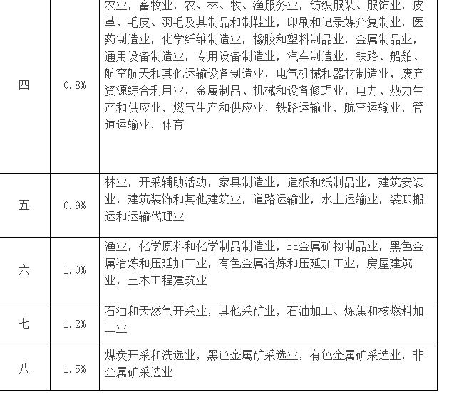 此外,工伤保险基准费率也将调整。按照《国民经济行业分类》,根据不同行业工伤风险程度,由低到高,依次将行业类别由原来的一至三类细分扩大为一至八类。不同工伤风险类别的行业执行不同的工伤保险行业基准费率。从2015年10月1日起,一至八类行业工伤保险基准费率分别为本单位从业人员缴费工资总额的0.2%、0.4%、0.7%、0.8%、0.9%、1.0%、1.2%、1.5%。