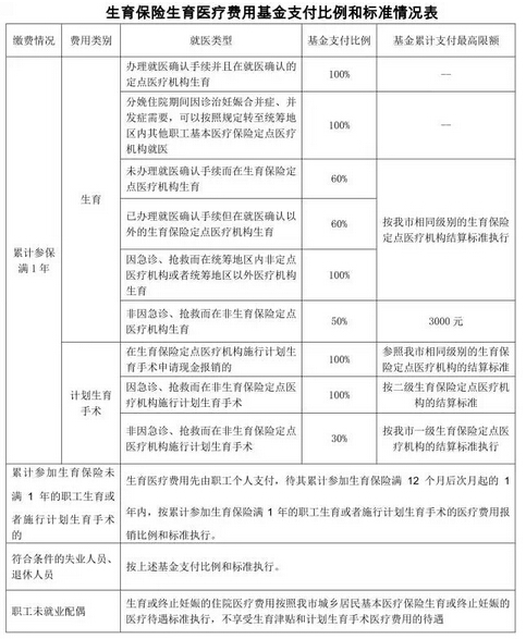 2015年6月30日(含6月30日)前,累计参加生育保险满1年的职工按规定到参保地社会保险经办机构办理报销手续。2015年7月1日后,累计参加生育保险满1年的职工已办理就医确认手续并且在就医确认的定点医疗机构生育的,其生育的医疗费用由参保地社会保险经办机构与定点医疗机构直接结算。具体生育医疗费用待遇标准详见《生育保险生育医疗费用基金支付比例和标准情况表》。