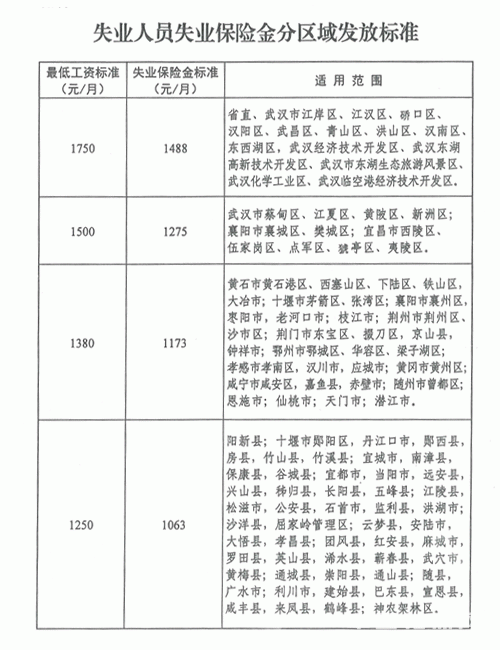 《湖北省人力资源和社会保障厅、省财政厅关于提高失业人员失业保险金发放标准的通知》(鄂人社发【2018】8号)文件精神,进一步保障失业人员基本生活,失业金标准上调:根据《湖北省失业保险实施办法》(省政府令第235号)、《省人民政府关于调整全省最低工资标准的通知)(鄂政发[2017]44号)和《人力资源社会保障部、财务部关于调整失业保险金标准的指导意见》(人社部发[2017]71号),经省人民政府同意,决定从从2017年11月1日起,将全省失业保险金标准从最低工资标准的70%提高至85%,全省失业保险金发放标准分区域提高到1488元/月、1275元/月、1173元/月、1063元/月。各档标准使用区域范围见下图: