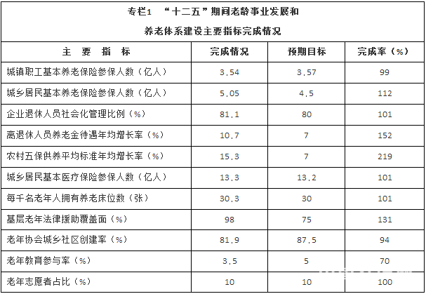 “十二五”时期我国老龄事业和养老体系建设取得长足发展。《中国老龄事业发展“十二五”规划》、《社会养老服务体系建设规划(2011—2015年)》确定的目标任务基本完成。老年人权益保障和养老服务业发展等方面的法规政策不断完善;基本养老、基本医疗保障覆盖面不断扩大,保障水平逐年提高;以居家为基础、社区为依托、机构为补充、医养相结合的养老服务体系初步形成,养老床位数量达到672.7万张;老年宜居环境建设持续推进,老年人社会参与条件继续优化;老年文化、体育、教育事业快速发展,老年人精神文化生活日益丰富;老年人优待项目更加丰富、范围大幅拓宽,敬老养老助老社会氛围日益浓厚,老年人的获得感和幸福感明显增强。