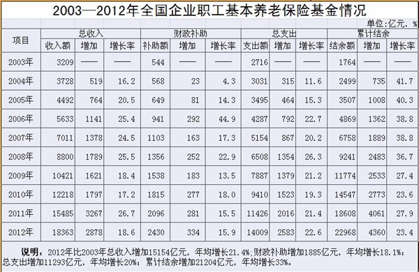 据“2003—2012年全国企业职工基本养老保险基金情况”,2012年总收入18363亿元,财政补助2430亿元,总支出14009亿元,结余22968亿元。