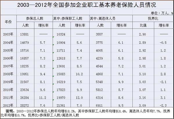 2003—2012年,全国参加企业职工基本养老保险总人数年均增长8.2%,其中参保职工人数年均增长8.4%,离退休人员年均7.7%,抚养比年均增长0.7%(抚养比=参保职工人数/离退休人数)。