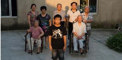 长寿之乡的老龄化困局:这是江苏如东县双甸镇星光居委会19组的一户四世同堂人家。20岁的大学生刘心雨(前中)未来可能面临巨大的隐形养老压力。后排左起依次为:45岁的母亲、91岁的曾祖母、68岁的奶奶、66岁的外公、47岁的父亲、90岁的曾祖父、69岁的爷爷。