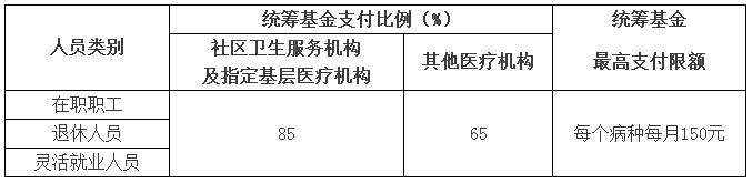 参保人患有上述慢性病的,在指定定点医疗机构确诊登记后,可在具备治疗资格的定点医疗机构门诊就医,属于指定慢性病相应的门诊专科药品目录范围内的药费,由基金按规定比例支付,每一种指定慢性病每月支付最高上限为150元,当月有效,不滚存、不累计,参保人最多可选择其中3个病种享受医疗保险待遇。基金支付比例如下: