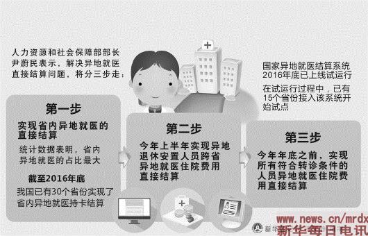 他介绍,第一步是实现省内异地就医的直接结算。统计数据表明,省内异地就医的占比最大。截至2016年底,我国已有30个省份实现了省内异地就医持卡结算。第二步是今年上半年实现异地退休安置人员跨省异地就医住院费用直接结算。