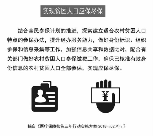 日前,国家医保局、财政部、国务院扶贫办印发 《医疗保障扶贫三年行动实施方案(2018-2020年)》。 方案明确, 到2020年, 农村贫困人口全部纳入基本医保、 大病保险和医疗救助保障范围, 农村贫困人口医疗保障受益水平明显提高。