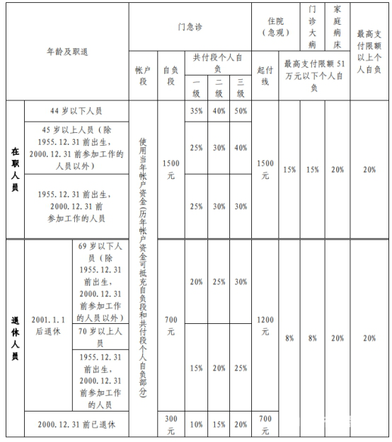 在职职工一年内住院(含急观)发生的符合医保规定的费用,设起付标准 1500元,超过部分,由医保基金支付85%。在门诊进行大病治疗发生的费用,由医保基金支付85%。家庭病床发生的费用,由医保基金支付80%。