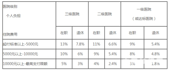 参保人员符合统筹基金支付范围的住院医疗费用每次达到统筹基金起付标准以上、最高支付限额以下的部分,主要从统筹基金中支付,个人也要负担一定比例,参保人员个人具体负担比例见下表(按分段累计计算):